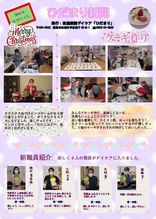 デイケアでの活動新聞【ひだまり新聞】 最新号 2026年1月 第73号 クリスマス会ケーキ作り新職員紹介 最新号はこちら(PDFが開きます) (PDF ファイル 0.93MB) ひだまり新聞 2025年 ひだまり新聞 2025年5月 第69号 (PDF ファイル 0.79MB) ひだまり新聞 2025年7月 第70号 (PDF ファイル 0.74MB) ひだまり新聞 2025年9月 第71号 (PDF ファイル 0.31MB) ひだまり新聞 2025年11月 第72号 (PDF ファイル 0.71MB) バックナンバー