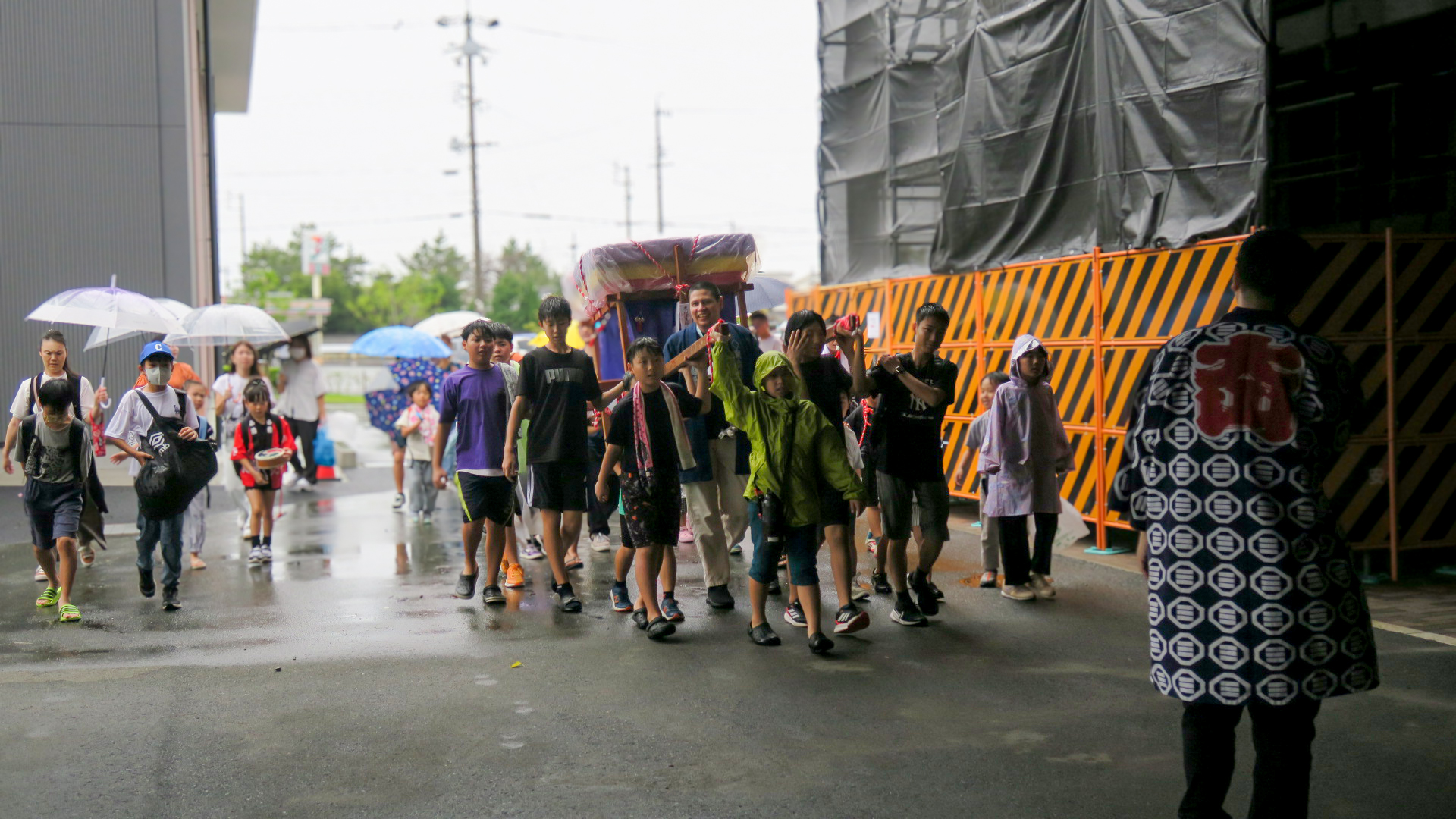 余興として、中心となるものが「子供神輿」「大人神輿」。4日の「子供神輿」の際には、町内を“うねり”その安全と町民の健康を祈念してまわります。当日は雨がそぼ降る悪天候のなか、当院にもうねっていただきました。お囃子とともに整然として歩く姿は勇壮です。担ぎ手である子供たちの力強い掛け声と勢いに圧倒されました。地域にかける熱い思いや町内の団結力が垣間見えるものでした。
