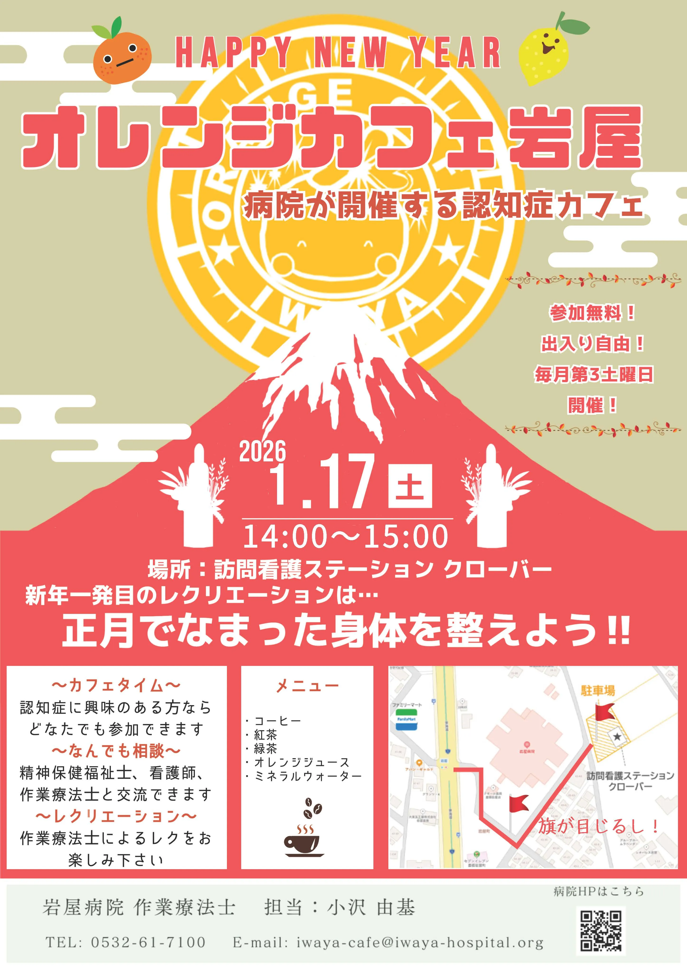 令和8年1月オレンジカフェ岩屋、開催のお知らせ 1/17(土)14:00から今月のオレンジカフェ岩屋を開催します。場所は当院の訪問看護ステーションクローバー内です。参加は無料で予約も不要のため、お気軽にお越しください。