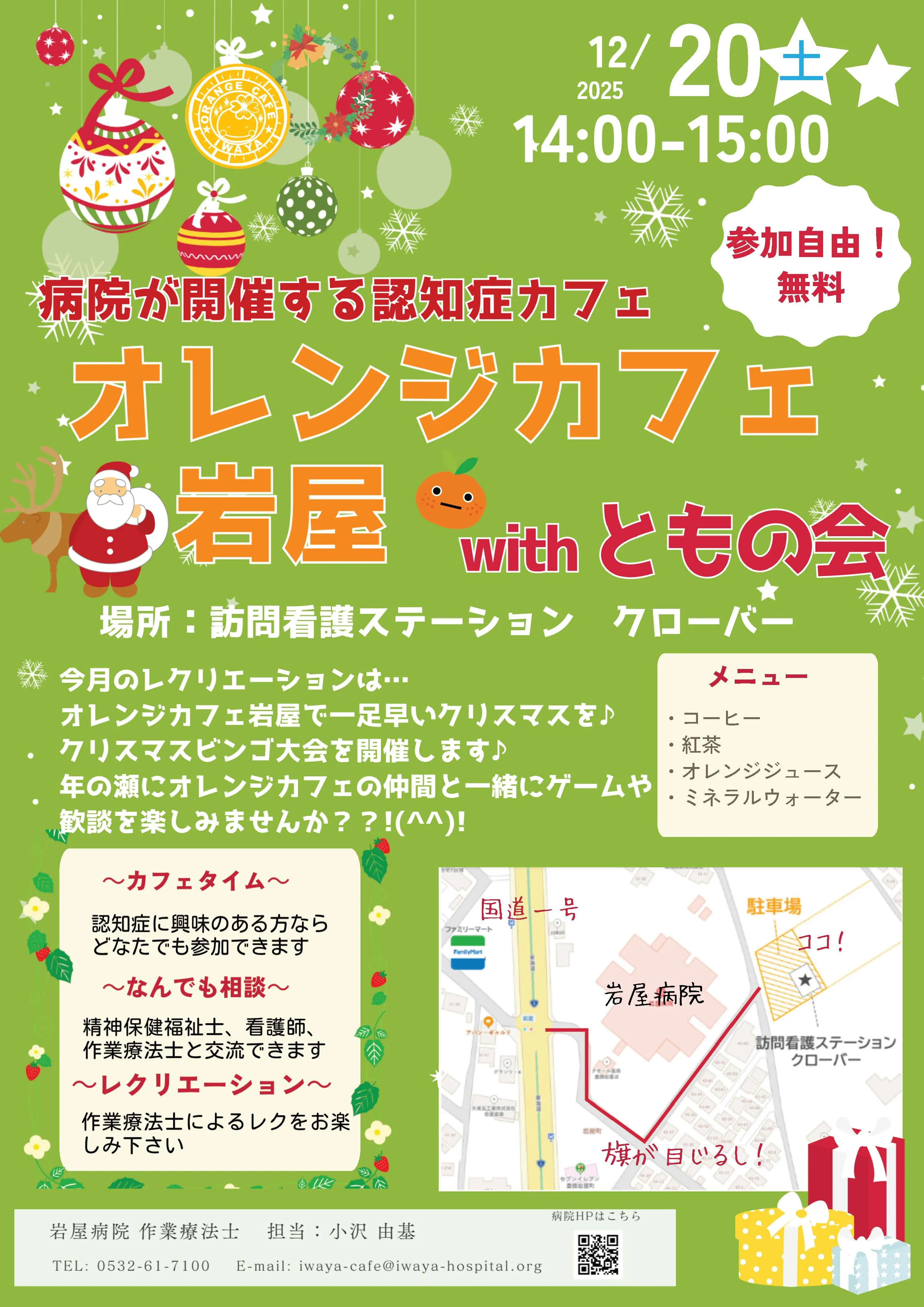 12月のオレンジカフェ岩屋、開催のお知らせ 12/20(土)14:00から今月のオレンジカフェ岩屋を開催します。場所は当院の訪問看護ステーションクローバー内です。参加は無料で予約も不要のため、お気軽にお越しください。
